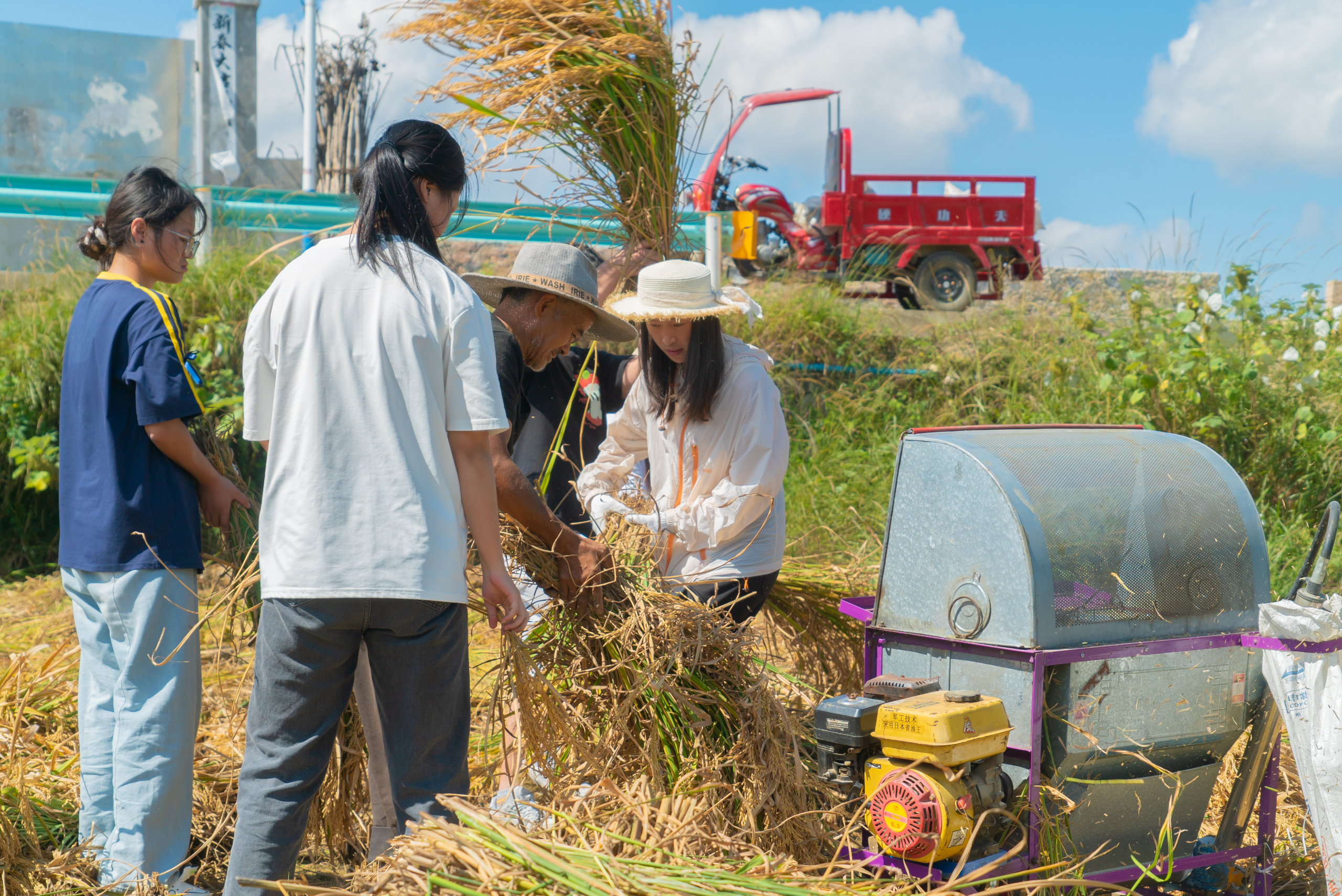 抵达路寨村后,连片稻田里金黄的谷穗随风摇曳,村民们忙碌的身影点燃了学员们的热情。在郭薇书记及村民的指导下,学员们迅速掌握了割谷、打谷、装袋的技巧,纷纷拿起镰刀、扛起粮袋,穿梭于田间地头。张福高书记与两位老师带头参与劳作,一边收割谷子,一边与郭薇书记深入交流,了解村情民意,探讨粮食产销和乡村治理等实际问题特别是三农法律相关实务问题。师生党员分工协作,汗水浸透了衣衫,但干劲不减,大家以实际行动践行着“为人民服务”的初心使命。