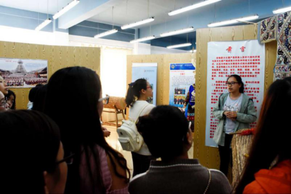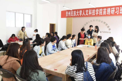 在开班典礼结束之后,左丹副院长还组织初级班学员参观学院非物质文化遗产展示厅,以实物展示的方式让学员们直观地接触和学习到民族文化。之后,带领学员们回到教室进行苗绣实践课。