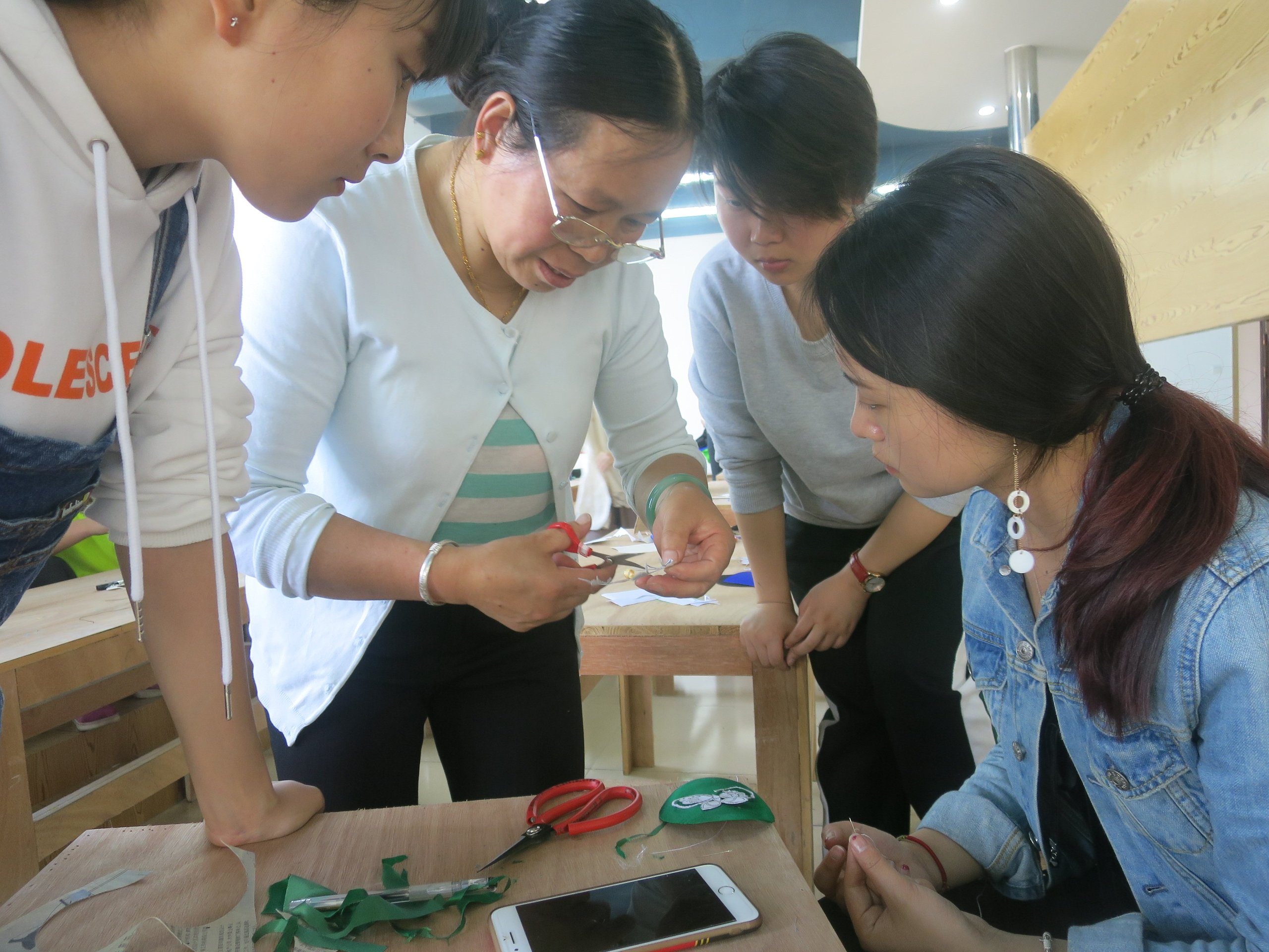 开班典礼后,第三期初、中、高级版班学员在李春英老师带领下开始了苗绣实践学习,本期中、高级班学员将把苗绣针法与自己创意结合,分别进行扇面、长裙制作。