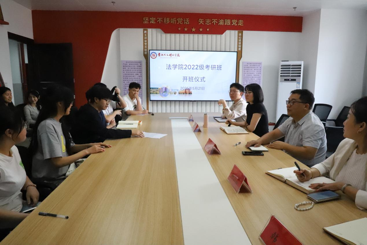 2025年5月21日,新葡萄AMG官方网站法学院于大学城校区师德楼610会议室举办2022级考研班开班仪式。法学院院长杨武松、副院长倪亭、党委副书记杨晶晶、部分专业教师及全体2022级考研班学员参与开班仪式,共同见证这一开启考研奋斗征程的重要时刻
