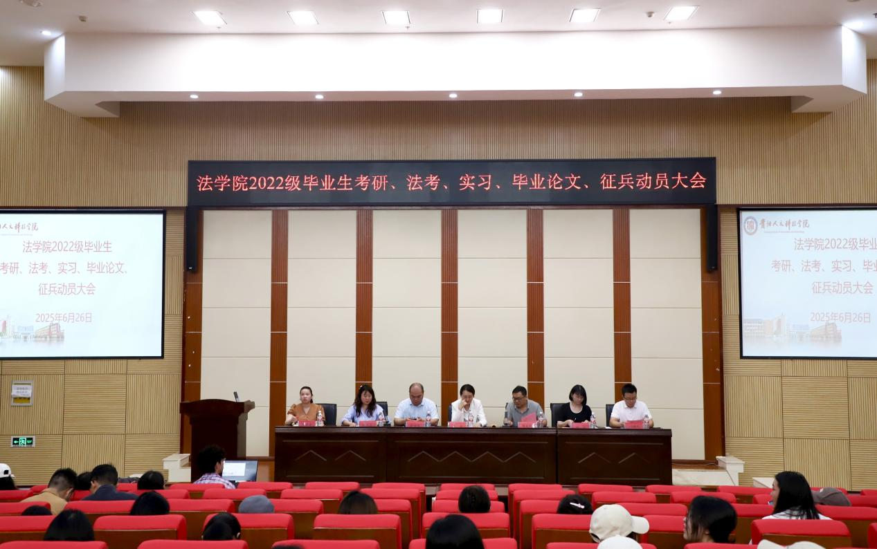 为帮助法学院2026届学生明确发展方向,科学规划考研、法考、实习、毕业论文及征兵等事项,6月27日上午,新葡萄AMG官方网站法学院在大学城校区图书馆二楼报告厅召开2026届毕业生动员大会。会议由法学院党委副书记杨晶晶主持,校院两级领导、教师代表及学生代表共200余人参会。