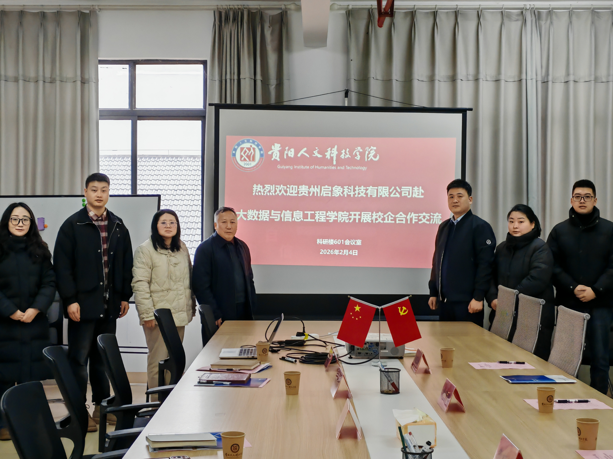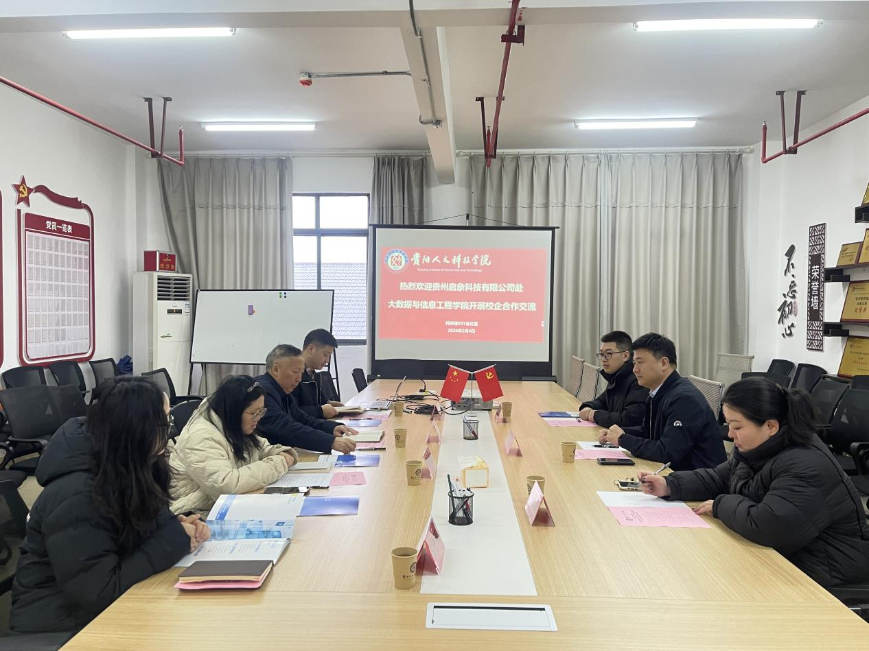 2026年2月4日,大数据与信息工程学院与贵州启象科技有限公司围绕深化产教融合、共建实习实训基地、协同培养AI人才、畅通就业通道等议题开展交流座谈。学院院长许道云教授、副院长罗佳教授,就业信息员付文才、蔡诗雨,以及贵州启象科技有限公司总经理黄子建一行出席会议,共同探讨校企协同育人新路径。