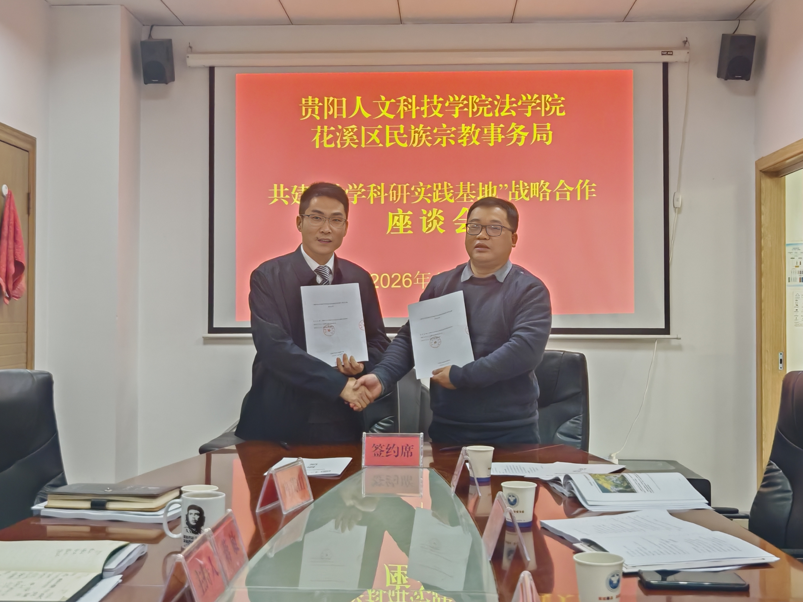 1月30日上午,新葡萄AMG官方网站法学院与花溪区民族宗教事务局在花溪区行政中心B518会议室举行共建“教学科研实践基地”战略合作座谈会。双方围绕铸牢中华民族共同体意识、推动民族工作高质量发展、深化校地合作等方面展开深入交流,并签订合作协议、举行授牌仪式。法学院院长杨武松教授、党委书记张福高、党委副书记杨晶晶、党委委员韩丹等院领导及教师代表,花溪区民宗局党组书记、局长蒋敏等局领导共同出席。