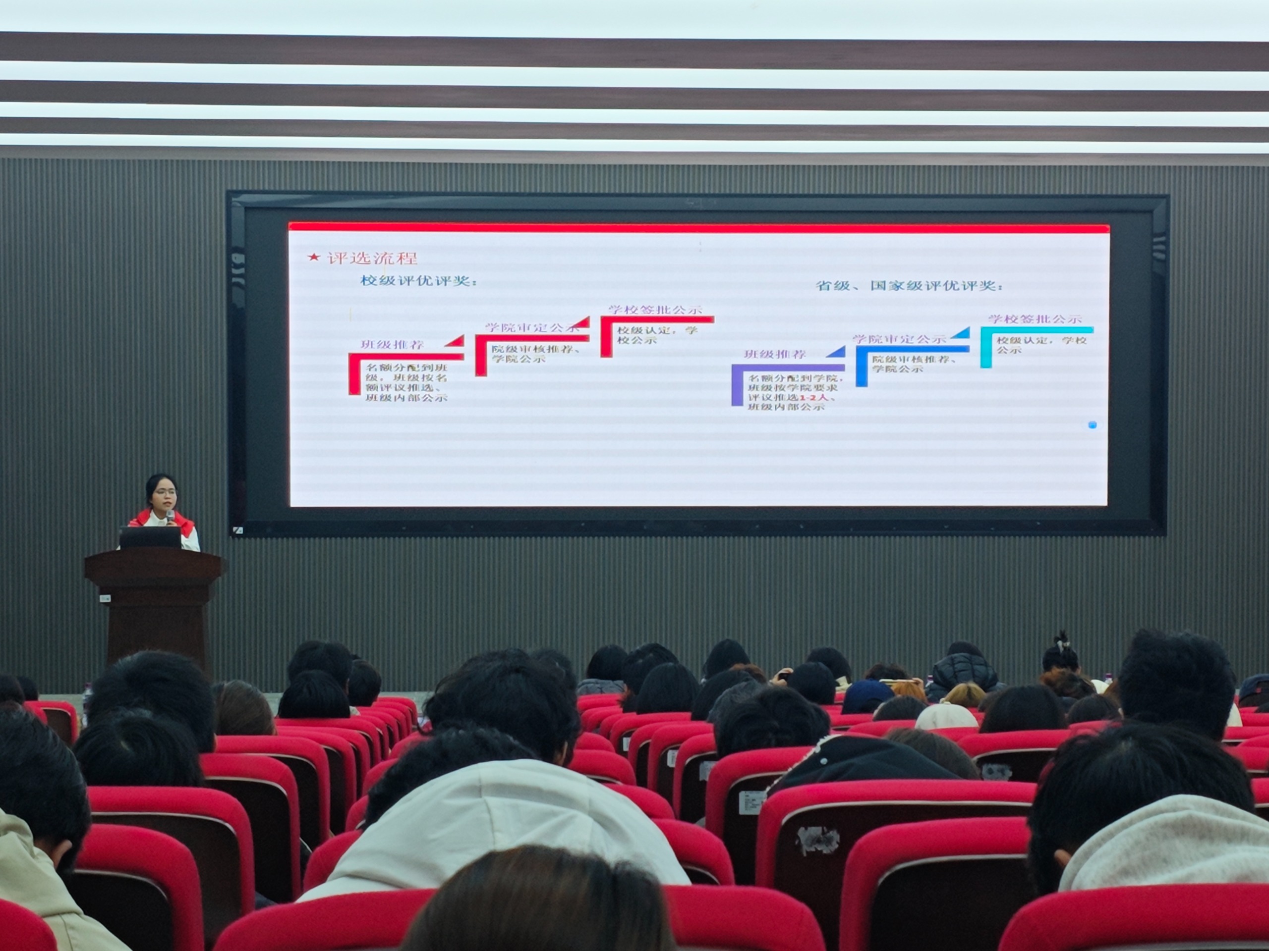 宣讲员聚焦校级、省级各类荣誉称号的评选工作,系统解读评选标准与申报流程,重点围绕三好学生、优秀学生干部、优秀毕业生、先进班集体等荣誉项目,逐一明确申请条件、材料规范与评审要求。宣讲过程中,特别作出强调:“省级荣誉评选对体测成绩设置更高门槛,往年不乏同学因体测成绩未达‘良好’等次,错失宝贵的申报机会。希望同学们加强体育锻炼,提前做好准备。” 同时,团队成员结合往届真实案例,分享平衡学业深造与综合素质提升的实操经验,为同学们规划发展路径提供有益借鉴。
