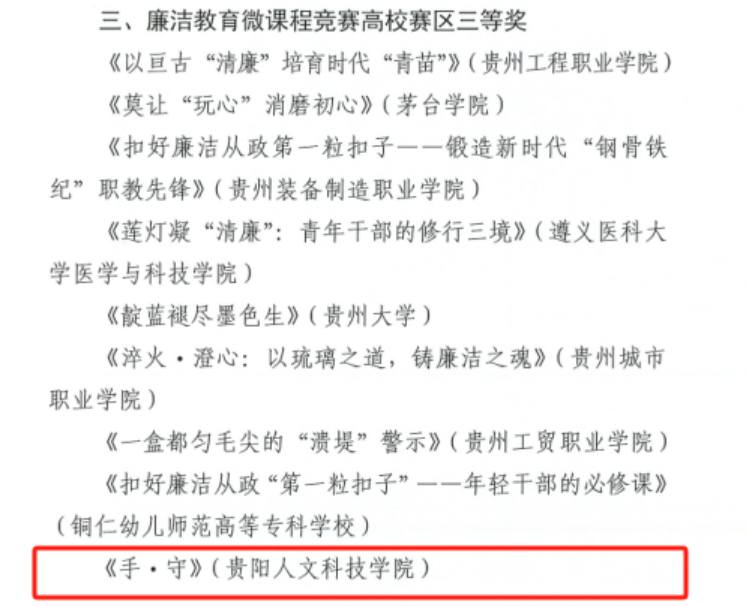 近日,省委教育工委公布了2025年贵州省年轻干部廉洁教育微课程竞赛高校赛区获奖名单,新葡萄体育与艺术学院刘璐、张鸿雁、支胜杰三位教师组成的团队精心创作,拍摄的微课程作品《手·守》荣获高校赛区三等奖