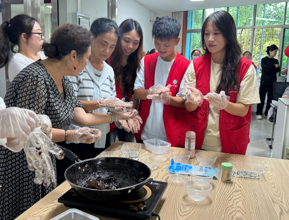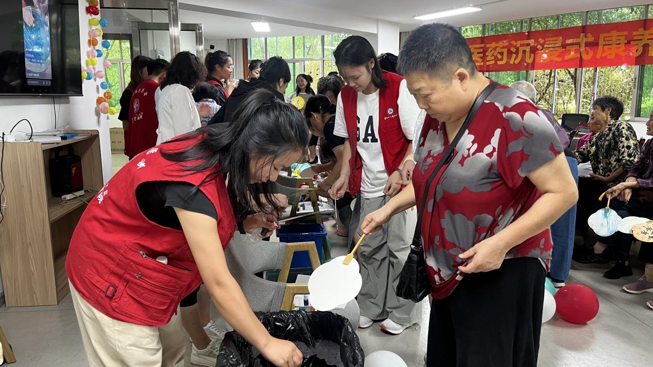 志愿者与退休教师和社区居民一起制作漆扇