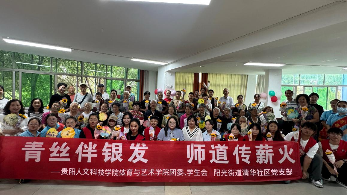 9 月 9 日,体育与艺术学院团委书记张鸿雁带领学院12名学生会志愿者走进清华社区,在社区活动中心与社区和康之佳药业联合开展 “青丝伴银发 师道传薪火”主题活动,活动现场,社区30余名退休老教师与辖区居民群众共 60 余人参与其中,以 “关怀” 、 “共创”、“传承”续写教育人之间的温情故事。