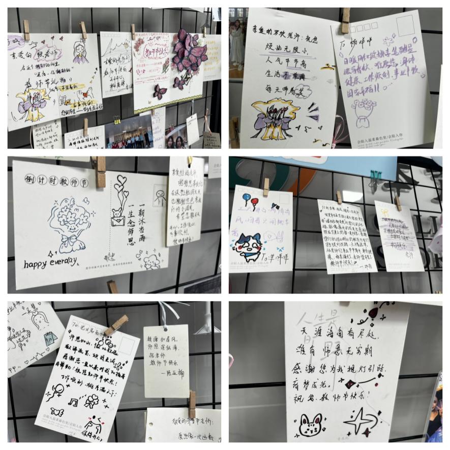 活动当天,学院学生会将来自学院不同专业学生的贺卡、手作礼物以及提前准备的实用小礼物在师德楼9 楼、10 楼电梯口布置成温馨的祝福墙和礼物角,志愿者们代表学院学子向学院全体教职工送去声声祝福,并引导老师们在礼物角领取专属自己的教师节礼物。