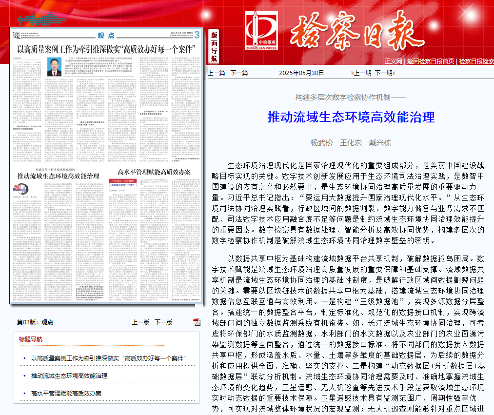近日,《检察日报》第3版刊载了新葡萄AMG官方网站教授杨武松与威宁自治县人民检察院王化宏、戴兴栋共同撰写的《构建多层次数字检察协作机制——推动流域生态环境高效能治理》一文。