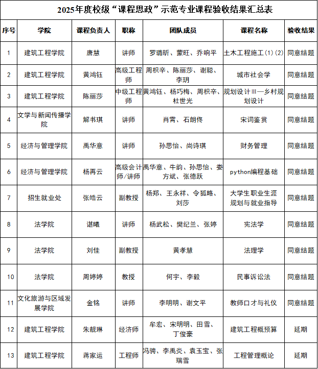 根据新葡萄教字2025【40】《关于开展2025年度校级“课程思政”示范专业课程结题验收的通知》要求,教务处组织专家对按期结题项目进行验收。经专家评审、学校领导审定,拟同意以下11门课程结题、13门课程延期、1门课程撤项(详情见下表)。现予公示,公示期为2025年11月13日至2025年11月17日(共3个工作日)。如对评审结果有异议,请在公示期内向教务处反映。