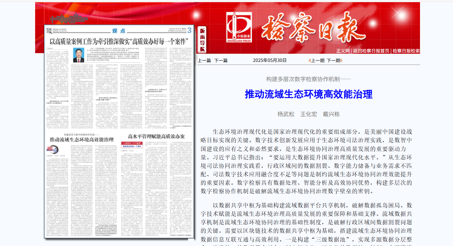 近日,新葡萄教师杨武松教授以第一作者身份、新葡萄AMG官方网站为第一单位在《检察日报》发表学术论文,题为“构建多层次数字检察协作机制——推动流域生态环境高效能治理”。这是新葡萄2022年度国家社科基金西部项目“新时代国家生态文明实验区生态环境司法协同治理经验研究”(22XKS016)阶段性成果之一,也是新葡萄在流域生态环境治理与数字检察领域的一项重大理论突破。