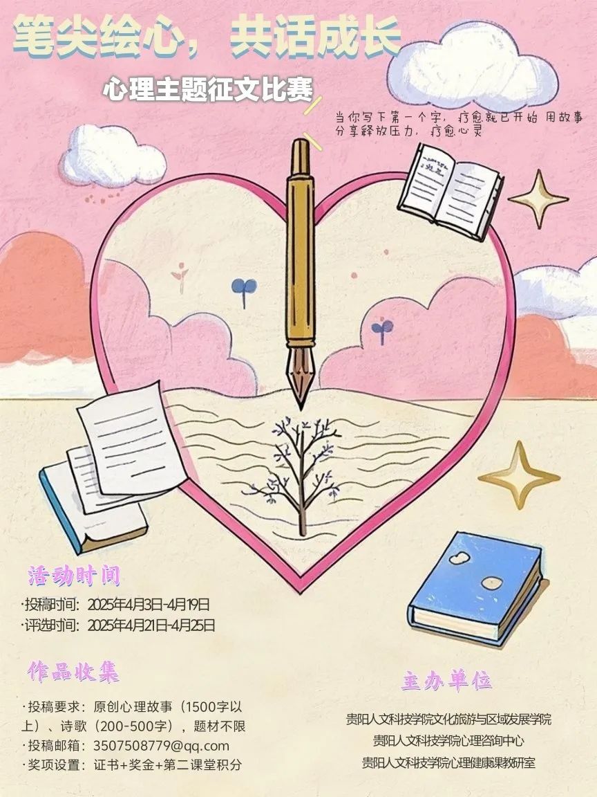 “笔尖绘心,共话成长”心理征文比赛火热开启,期待你用文字记录内心的声音,分享成长路上的心灵故事,赢取丰厚奖品!