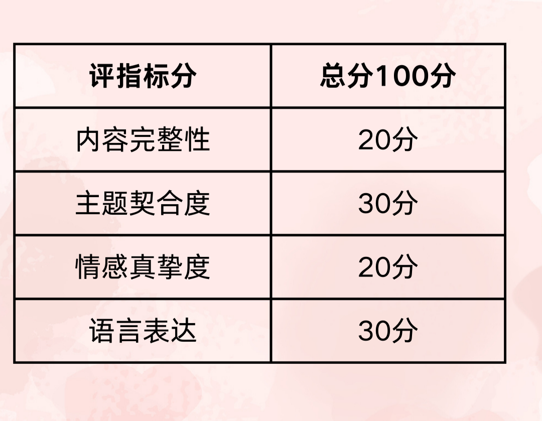 评比标准:征文评比将遵循公平、公正、公开的原则,以主题契合度、内容完整性、情感真挚度、语言表达为主要评比标准。如下表: