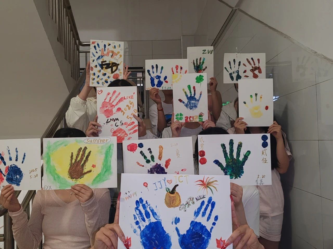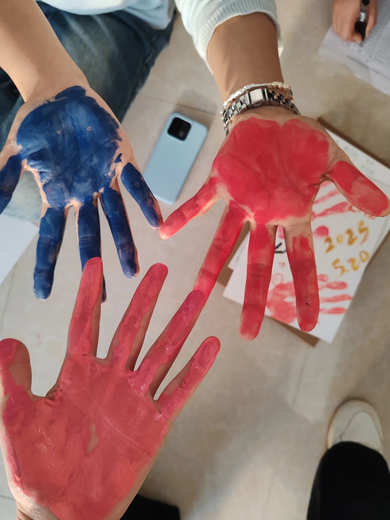在朝气蓬勃、阳光正好的五月,我们迎来了一个充满爱意的日子——5月25日,大学生心理健康日,“5.25”谐音“我爱我”,寓意着关爱自我、了解自我、接纳自我。为了让每一位同学都能深刻体会这份爱意,新葡萄AMG官方网站2023级大数据一班团支部特别举办了一场别开生面的“我爱我”主题团课活动,用彩色颜料在纸上印手掌,开启了一场与自我对话的奇妙旅程。