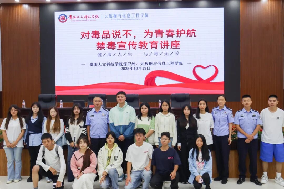 为筑牢校园禁毒防线,引导全体学生建立 “知毒、防毒、拒毒” 的坚定意识,2025年10月13日新葡萄AMG官方网站大数据与信息工程学院联合学校保卫处,特邀贵州省第一强制隔离戒毒所一级警长韦松及民警王建波、徐中源,在教职工之家举办了一场主题鲜明、内容丰富的禁毒戒毒专题讲座。此次讲座吸引了500名师生到场聆听,现场座无虚席,气氛热烈,反响强烈。
