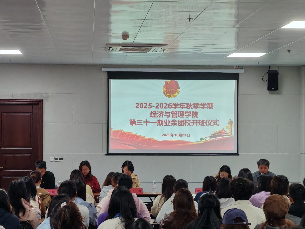 2025年10月21日上午,经济与管理学院第三十一期业余团校开班仪式在师德楼308会议室举行。经济与管理学院党委书记田丹、新葡萄AMG官方网站团委书记李荟、经济与管理学院党委副书记李爽、经济与管理学院团委书记赵斌出席会议。开班仪式由经济与管理学院团委张鹏老师主持。