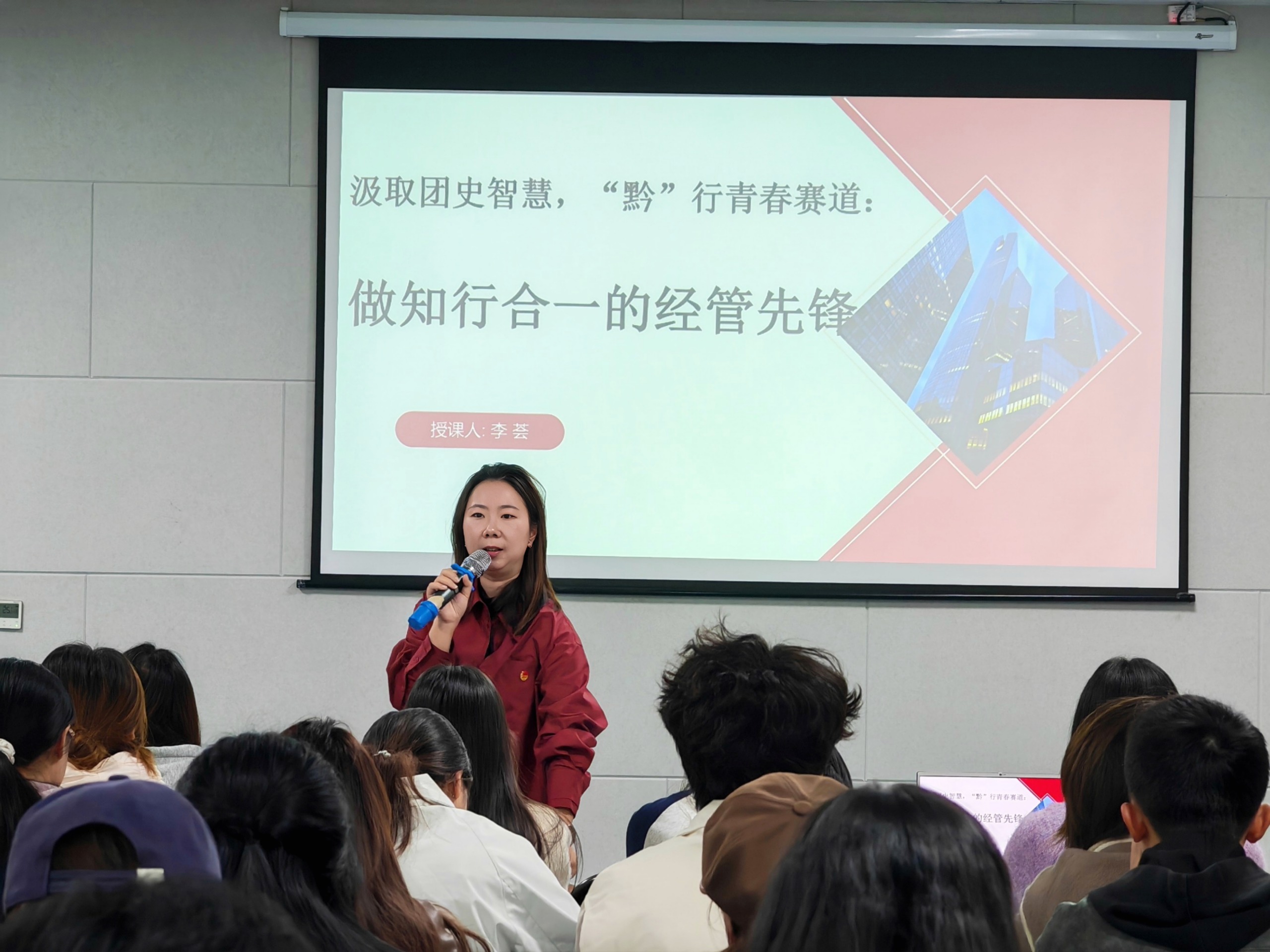 第一阶段,集中授课。团校于10月21日开始集中授课,学校团委书记李荟以“汲取团史智慧,‘黔’行青春赛道:做知行合一的经管先锋”作专题授课。课程系统回顾共青团百年奋斗历程,深入阐释“党有号召、团有行动”的优良传统与共青团作为党的助手和后备军的根本定位。