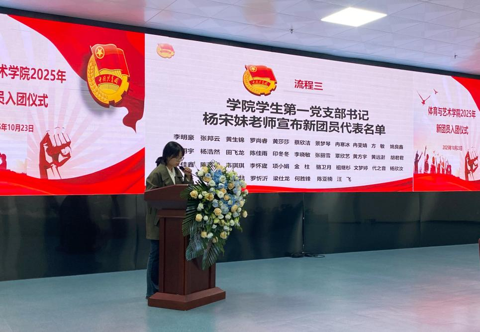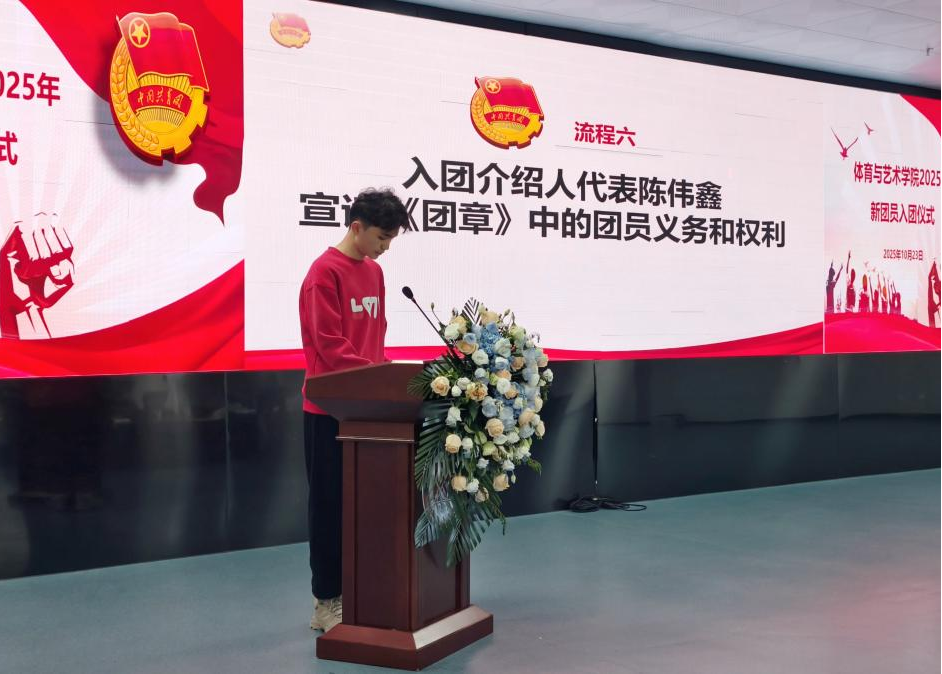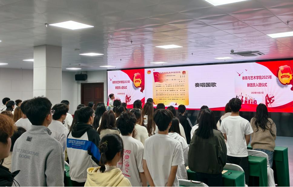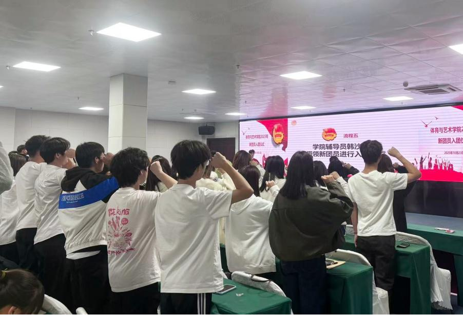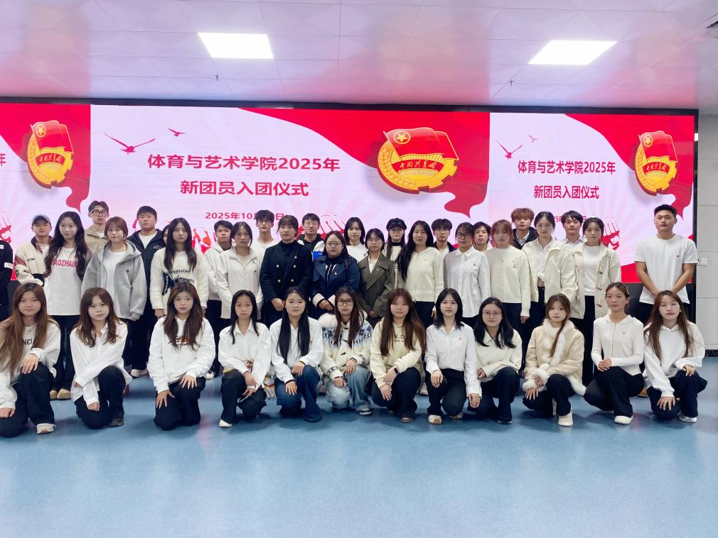 10月23日下午,体育与艺术学院团委在师德楼 307 会议室隆重举行 2025 年度新团员入团仪式。学院团委书记张鸿雁、学生第一党支部书记杨宋妹、辅导员韩沙,与各专业学生团干部代表、老团员代表共同见证学院本年度41名新团员加入共青团的庄严时刻。仪式由学院团委学生副书记吴晨主持。