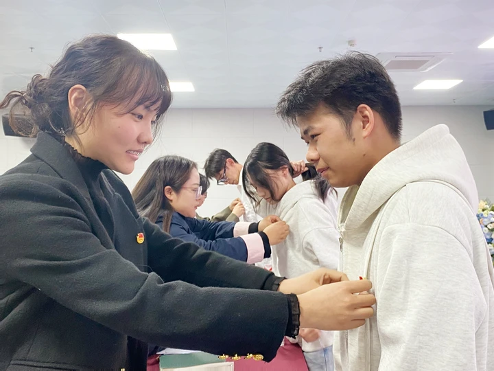 名单宣读完毕,出席仪式的老师、优秀学生团干部及老团员代表起身,郑重为每位新团员佩戴团徽。胸前闪耀的金黄色团徽,为新团员赋予了共青团员的身份,也将一份沉甸甸的责任与使命郑重交予他们。