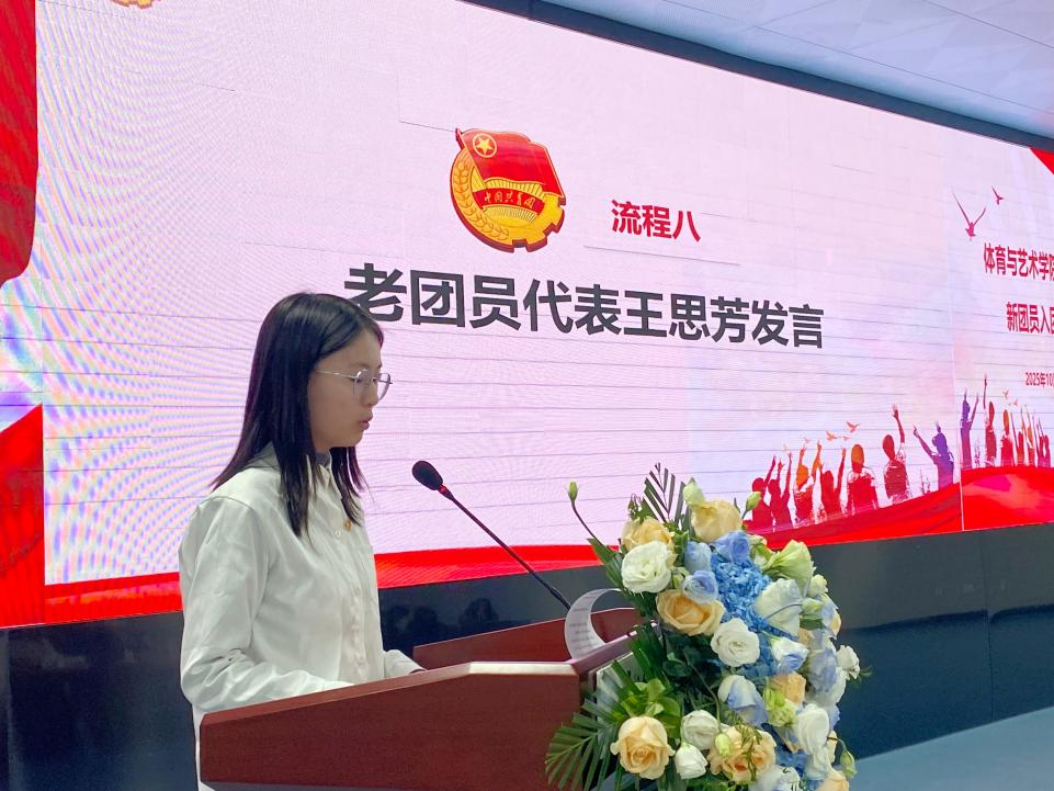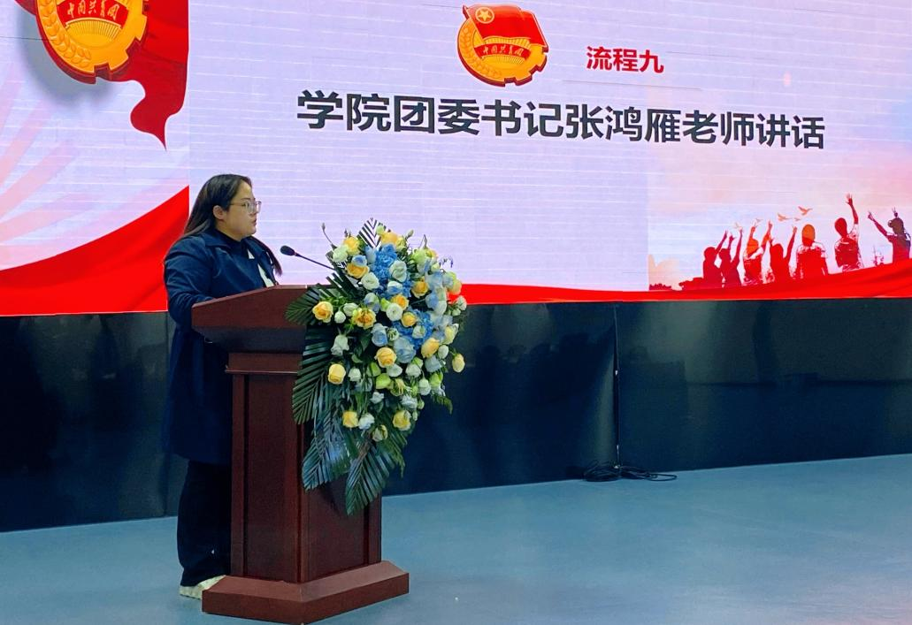 仪式接近尾声时,体育与艺术学院团委书记张鸿雁老师发表讲话。她对新团员的加入表示欢迎和祝贺,同时还针对学院不同专业学生的特点给出具体建议:鼓励体育专业学生既要努力争夺体育赛事奖杯,更要争做品德优良、专业过硬的全能型选手;叮嘱音乐专业学生深耕专业技能,用音符记录校园活力,用节奏传递对祖国的祝福,让音乐成为连接个人理想与集体追求的纽带;引导舞蹈专业学生把入团的激动、对理想的追求融入物资,在各类舞台和志愿服务中用舞蹈传递温暖与力量,展现青年朝气与担当;倡导美术、设计和动画专业的学生用画笔记录祖国发展、用设计助力文化建设、用动画讲好青年成长故事,让创新创意在服务与奉献中绽放光芒。他强调入团不是终点,二而是所有新团员奋斗的起点,作为体育与艺术相关专业的青年团员既要追求专业上的“精益求精”,更要追求思想上的“向上向善”,要将专业学习与时代使命紧密结合,让青年成长与时代发展同频共振。
