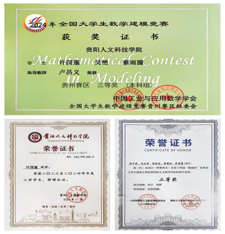 入学伊始,他便立志深耕专业。课堂上专注听讲,课后刻苦钻研,力求吃透复杂的土木工程原理。持之以恒的努力换来优异学业成绩,绩点名列前茅。2023-2024学年,荣获国家励志奖学金和校级优秀学生称号,这是对努力的肯定,更让他深切感受到国家和学校的关怀。在学科竞赛中,他与团队并肩作战,曾获全国大学生数学建模竞赛贵州赛区三等奖和“挑战杯”贵州省大学生创新创业计划竞赛校赛二等奖,在实践与理论的结合中不断提升。