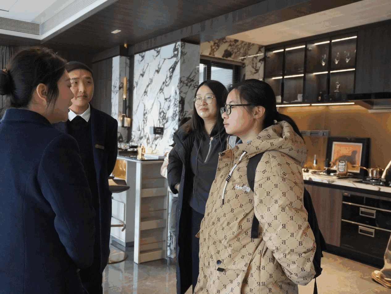 活动伊始,项目销售骨干吴云菲热情引导师生参观项目示范区、样板间及四大共享主题空间,细致解读项目“标准化、精细化、数字化”的运营理念。同学们围绕“年轻化人居需求”“城市极核地段价值”“精装户型设计美学”等前期拟定选题,进行实地调研,根据每组方案拍摄了大量图片和视频素材。