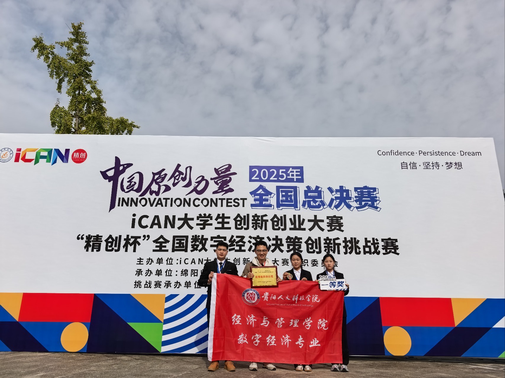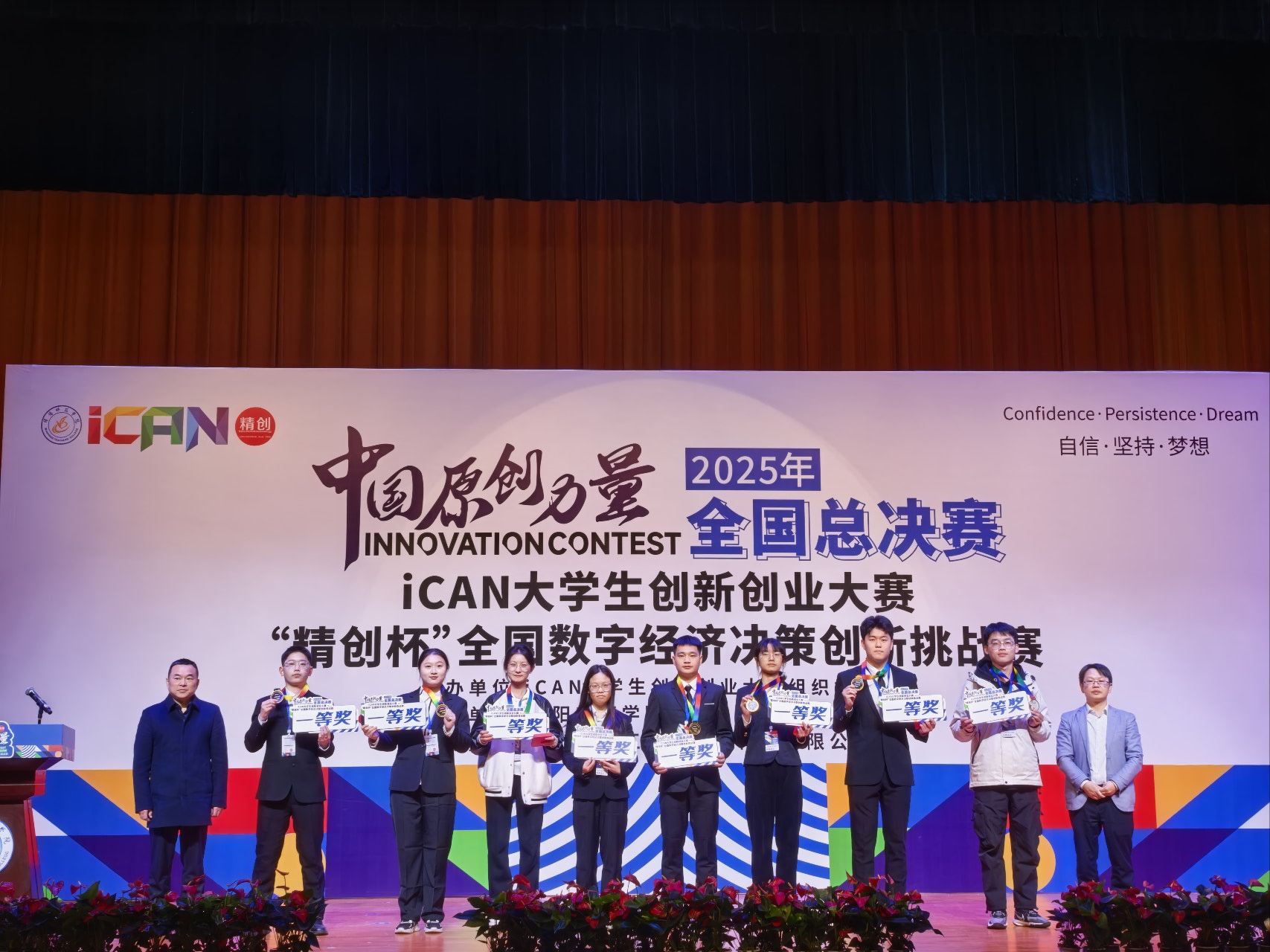 11月23日,2025年iCAN大学生创新创业大赛“精创杯”全国数字经济决策创新挑战赛全国总决赛在四川省绵阳师范学院落下帷幕。我院学子凭借出色的创新思维与实践能力在比赛中脱颖而出,荣获全国一等奖!