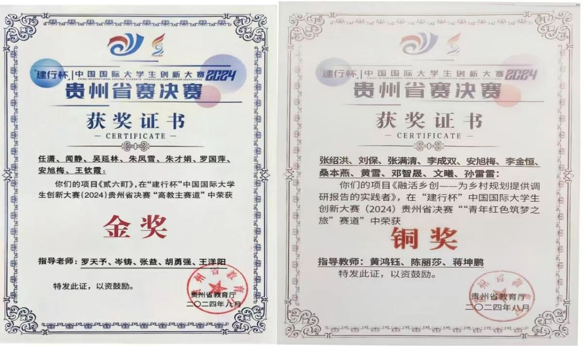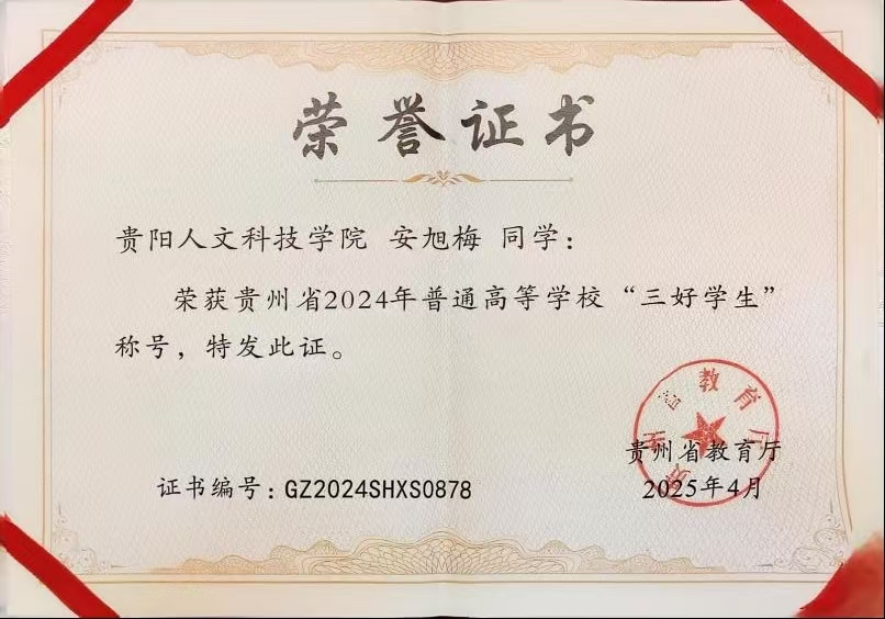 功夫不负有心人,在2022-2023学年获得了校级一等奖学金和“贵州省三好学生”称号。2023-2024学年获得了国家励志奖学金,以及“贵州省三好学生”、校级三好学生的荣誉称号。除了专业学习之外,她还积极参加各类学术竞赛。2024年在“建行杯”中国国际大学生创新大赛中,斩获贵州省决赛金奖和铜奖。