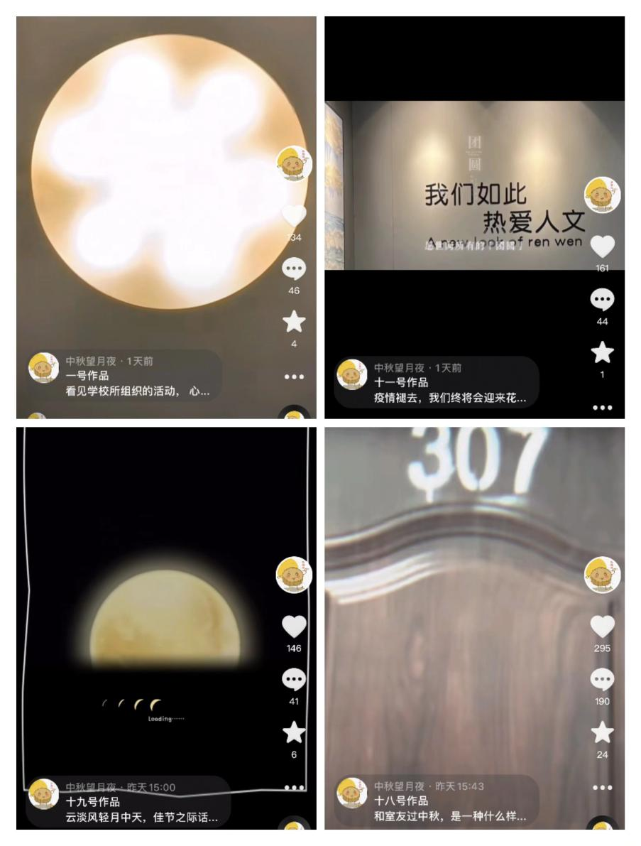 “今夜月明人尽望,不知秋思落谁家”,此次活动由经管学院学生会“抖音秀”拉开了帷幕,同学们积极参与,发挥各自想象力,创作出个性迥异的中秋主题大片,总浏览量超过3万余次,展现出新葡萄学子多才多艺的少年风采!