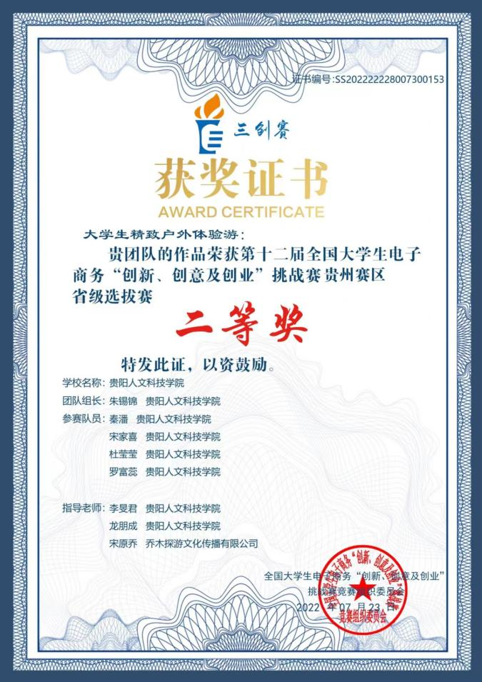 2022年6月,第十二届全国大学生电子商务“创新、创意及创业”挑战赛贵州赛区省级在新葡萄大学城校区举行,我院2019级休闲体育专业学子朱锡锦团队凭借《大学生精致户外游》项目获省级赛二等奖、最佳创业奖。