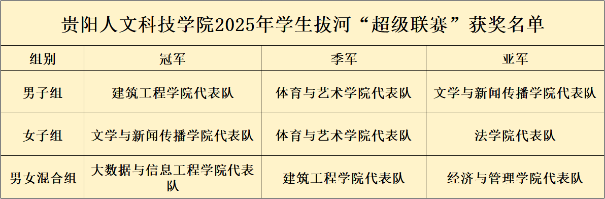 本次联赛严格遵循中国拔河协会最新竞赛规则,创新设置男女混合组、表演赛等项目,为传统体育项目注入青春活力,助力中华传统体育精神在校园传承创新。作为学校体育育人工作的集中展示与检验,此次赛事是推动群众性体育活动常态化、特色化的重要举措,既丰富了校园文化生活,更成为强化集体主义教育、磨练学生意志、提升综合素质的有效载体,践行了“以体育智、以体育心、以体育人”的办学导向。