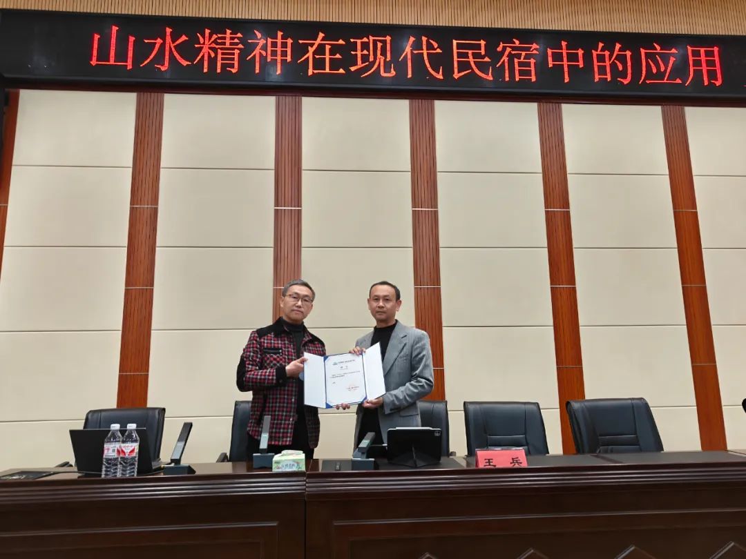 在欢迎致辞中,金院长向参会师生介绍了匠庐品牌在国内民宿行业中的地位与贡献,并向王兵先生介绍了我院“民宿经营管理”微专业建设情况。开讲前,学院向王兵先生颁发了客座教授证书,希望双方能在校企合作方面更加深入。