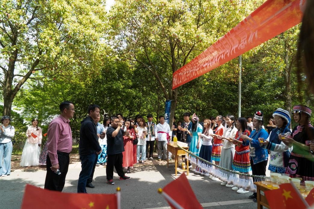 在民族小吃区,苦荞酥饼在石板上烙出云片,酥油茶盏里盛满雪山的体温,清明饭的竹香漫过铜锅,各民族炊烟里的诗篇正在味蕾上交织与融合。在民族米酒区与糯食区,白白胖胖的糯米在岁月的长河中演化出了糯米饭、清明粑、糯米酒等多样美食,师生共同品鉴传统的酿造技艺,感悟中华民族大家庭多元的饮食文化智慧。在民族服饰展区,苗绣图腾、藏袍广袖、银绣墨华……同学们试穿体验各民族服装、拍照打卡,中华民族衣锦的美学正在年轻血脉中苏醒。