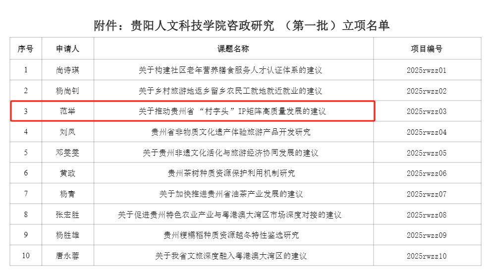 新葡萄AMG官方网站咨政研究(第一批)立项名单公示名单中,我院范举老师申报的《关于推动贵州省“村字头”IP矩阵高质量发展的建议》喜获立项。
