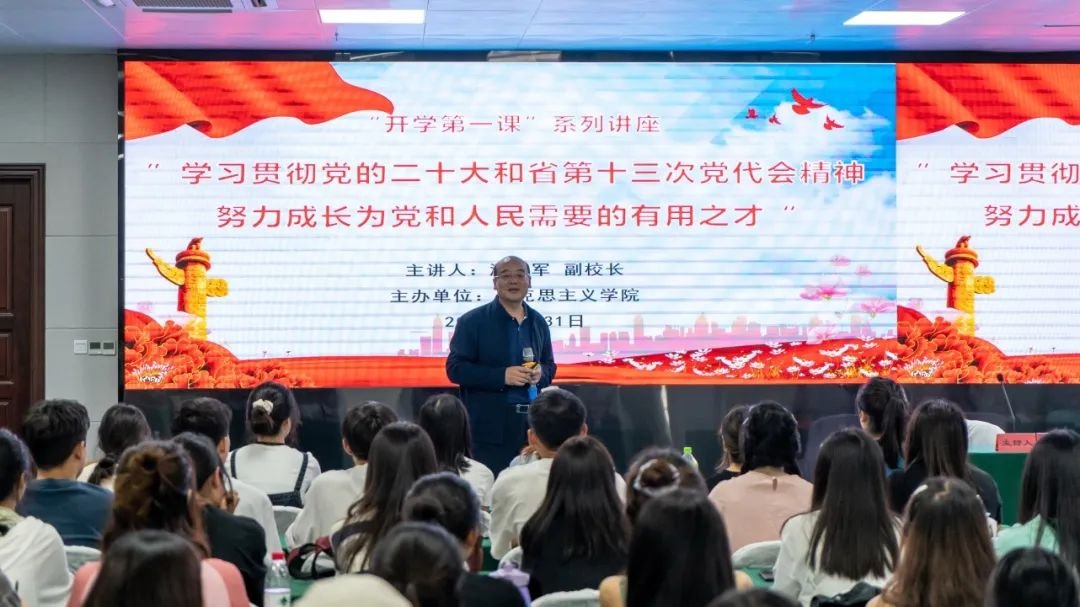8月31日下午,新葡萄在大学城校区组织开展了“开学第一课系列讲座之学习贯彻党的二十大和省第十三次党代会精神——努力成长为党和人民需要的有用之才”。本次讲座由副校长温小军主讲,马克思主义学院副院长罗成华主持,全校近200名学生参加。