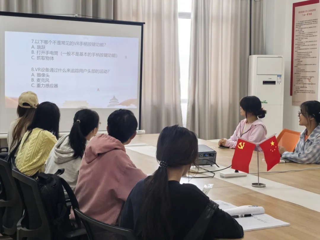 在活动中,大数据与信息工程学院 VR实验室指导老师卢昌义详细地向大家介绍了VR技术的相关知识,深入剖析了其广阔的技术发展前景以及多元的应用领域。实验室的成员们纷纷分享了自身在学习运用VR技术的收获与感悟,鼓励大家踊跃加入实验室,在亲身实践的过程中不断学习、茁壮成长。在参观体验后,通过组织VR知识竞赛进一步加深支部成员们对VR技术的了解和掌握。